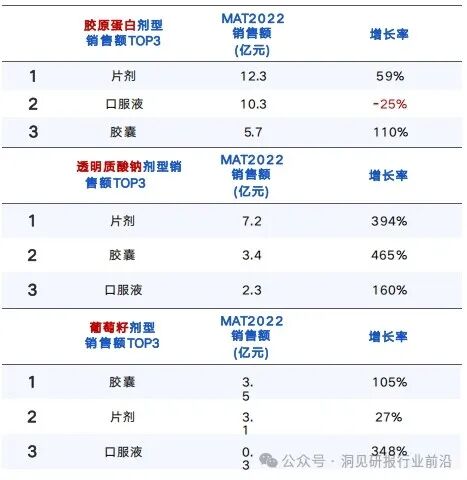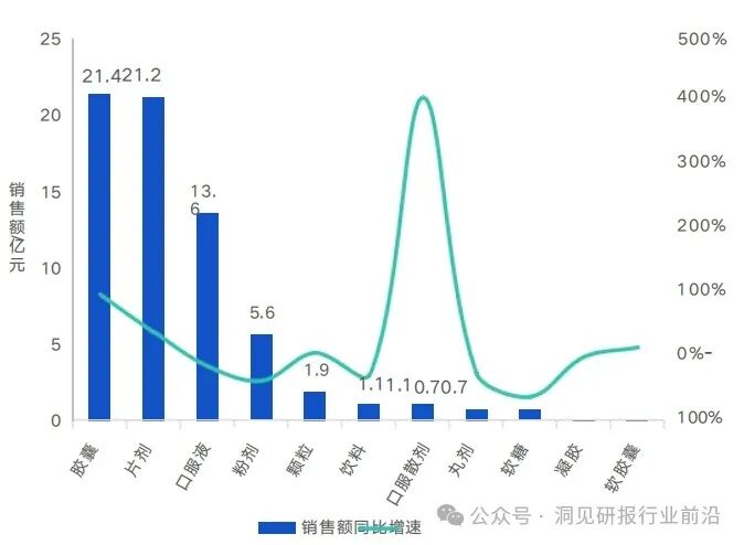 胶囊、片剂、口服液为口服美容市场主要的产品形态,在标注剂型属性字段的商品中,占比总和达80.9%;粉剂占比达8.1%。口服散剂增速较快,但整体规模较小;胶囊和片剂的销售额同比分别上升97%和39%;口服液销售额出现负增长。