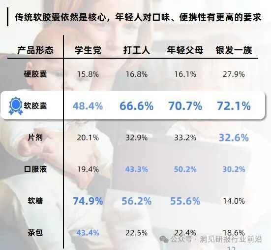 儿童成长保健品多以补充DHA等脂溶性成分和钙锌等维矿物质为主,软胶囊和口服液能加快营养物质吸收,便于营养成分的储存,且便于吞咽或作为辅食添加,因而成为赛道主流剂型。