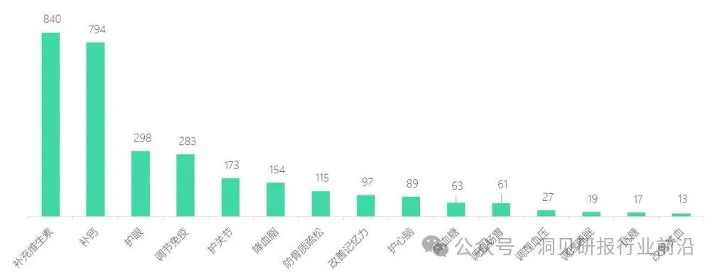 从保健品功效来看,补充维生素、补钙是中老年人最广泛的保健需求,相关产品交易指数分别为840、794。护眼、调节免疫、护关节、降血脂、防骨质疏松类保健品需求也较大,交易指数均大于100。