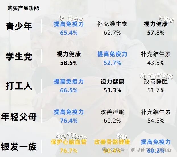 "提高免疫力"与"增强眼部保健"是当前各年龄段消费者的主要保健诉求。在保健品类型的选择上,消费者更偏爱传统的软胶囊剂型及多种关键成分复合的保健品。消费者主要关注品牌口碑、产品效用和安全性,此外独立便携的包装也是产品加分项。增加成分说明、提高产品性价比则是消费者普遍提出的诉求点。