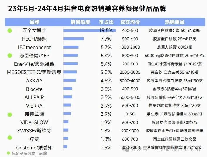 消费者对海外品牌喜好度相对更高,从品牌榜的热销单品来看,多为胶原蛋白口服液,抗老紧致是主流消费目的,其次为美白嫩肤。