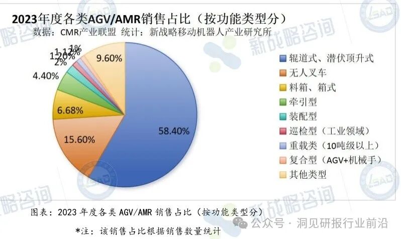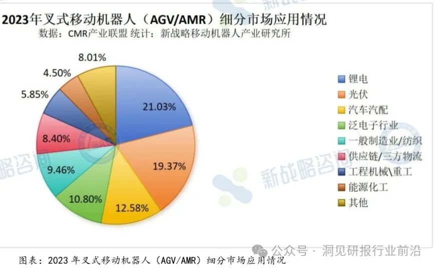 无人叉车的应用与下游细分行业的景气度息息相关,2023年,光伏行业增长迅猛,一跃成为移动机器人最大应用市场;其次是汽车汽配行业,受汽车市场回暖影响,对移动机器人需求有所回升;锂电行业占比第三,需求略有上升。