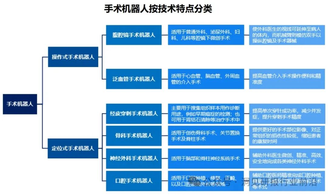 手术机器人按照技术特点划分可分为操作式手术机器人和定位式手术机器人。