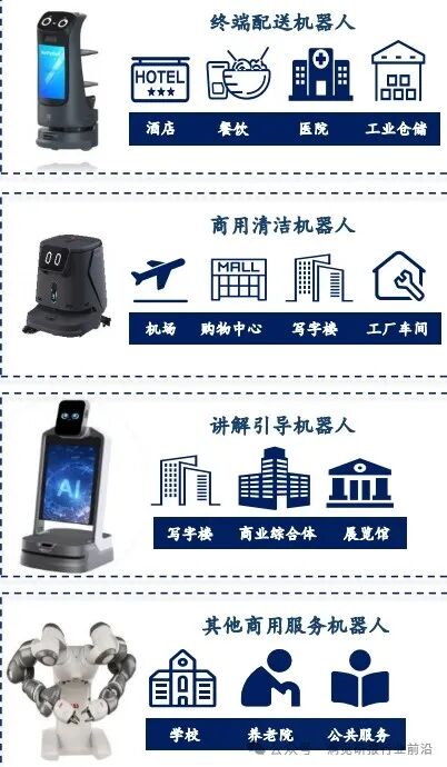 商用服务机器人具备自主移动和与人互动的能力,能够执行配送、引导、清洁等任务,广泛应用在餐饮、零售、酒店、工业、医疗、养老、教育、公共服务等领域根据其功能的不同,商用服务机器人通常可划分为商用清洁机器人、终端配送机器人、讲解引导机器人以及其他应用机器人。