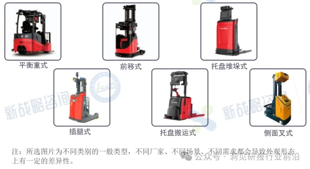 叉车类工业应用移动机器人是指作业安全性不取决于操作者,可自动行驶的又车(包括平衡重式、前移式、插腿式、托盘堆式、托盘搬运式、侧面叉式)。