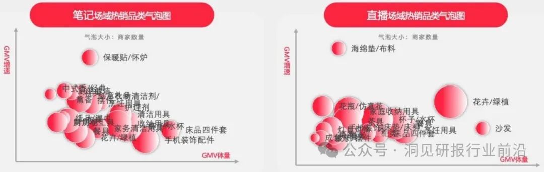 家居日百行业视角:灯饰/床品四件套/水杯等赛道在笔记增长强劲,香薰/鲜花/布料/花卉等在直播场域表现明显。