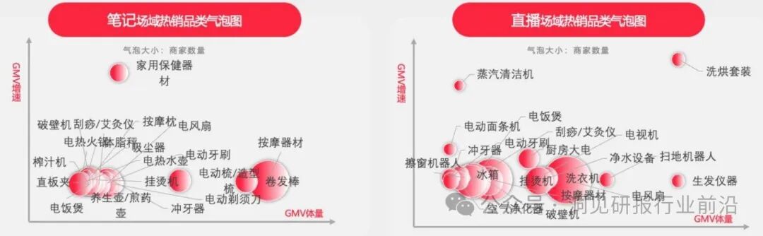 按摩仪器/卷发棒/电动剃须刀/电风扇等赛道在笔记增长强劲,生发仪器/蒸汽清洁机/电风扇/净水设备等在直播场域表现明显,尤其是节点膨胀率高。