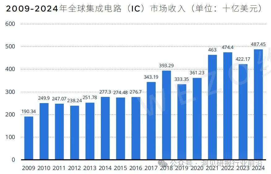 全球集成电路(IC)半导体市场的收入达到4221.7亿美元。预计到2024年,该市场将比前一年增长15.5%左右,达到4874.5亿美元。