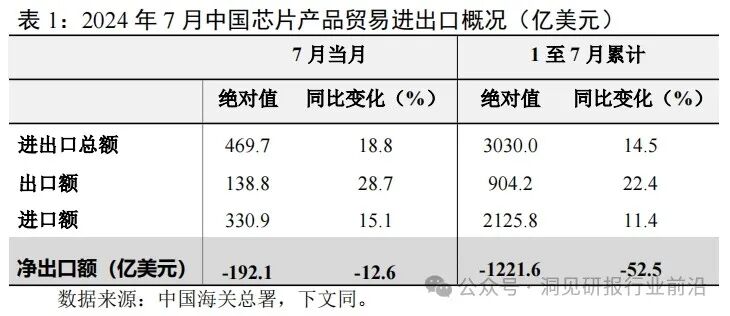2024年1-7月,中国芯片产品贸易累计进出口3030.0亿美元:同比增长14.5%。其中,出口904.2亿美元,同比增长22.4%;进口2125.8亿美元,同比增长11.4%。累计净进口1221.6亿美元。
