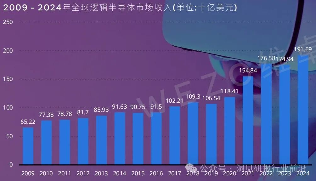 2022年,全球逻辑芯片市场规模约占整体半导体产品的23.2%。2023年,逻辑半导体的收入达到1749亿美元,略低于2022年的1766亿美元。对2024年的预测显示半导体逻辑元件的收入将再次增长,达到1916.9亿美元,增长9.6%。
