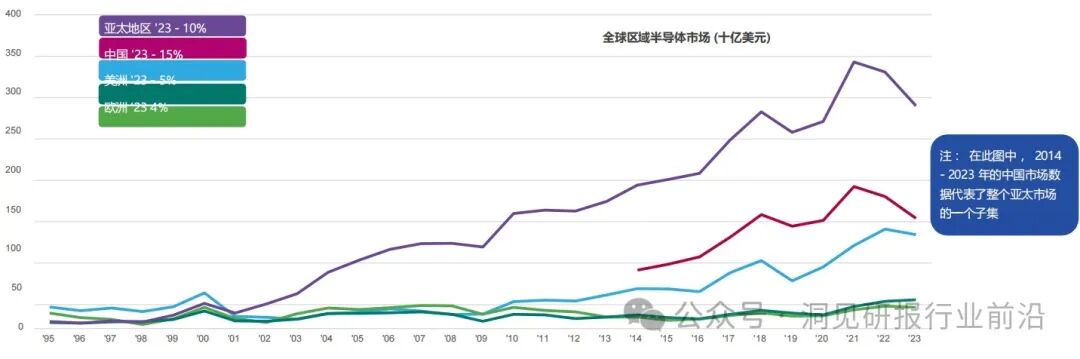 在2001年,亚太地区的市场在销售方面超越了所有其他区域市场,因为电子设备生产向该地区转移。从398亿美元增长至2023年的2900亿美元。迄今为止,亚太地区最大的国家市场是中国,占亚太地区市场的53%和全球市场的29%。