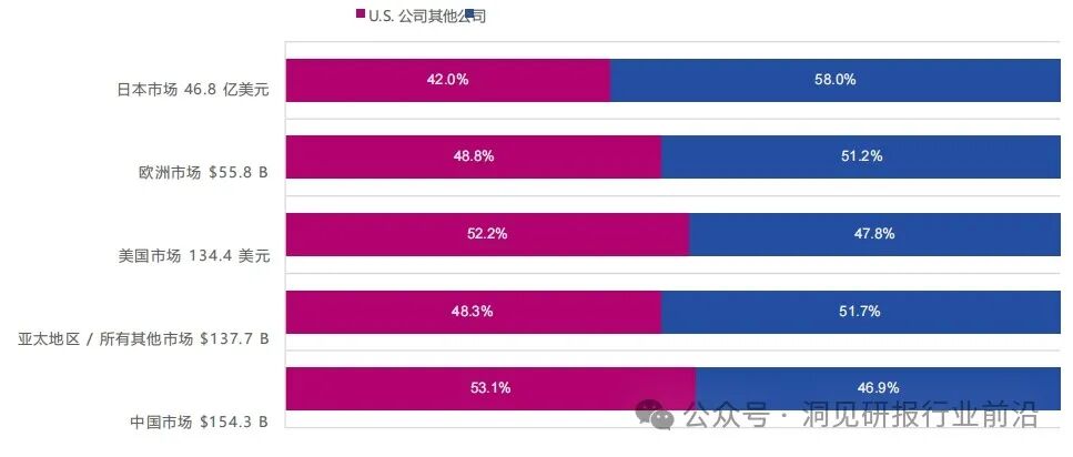 在2023年,美国的半导体企业在全球半导体市场占据了50.2%的份额,这是任何国家的半导体产业中最高的比例。在美国及其主导的主要国家和区域半导体市场中,总部位于美国的公司也保持着销售市场份额的领导地位。