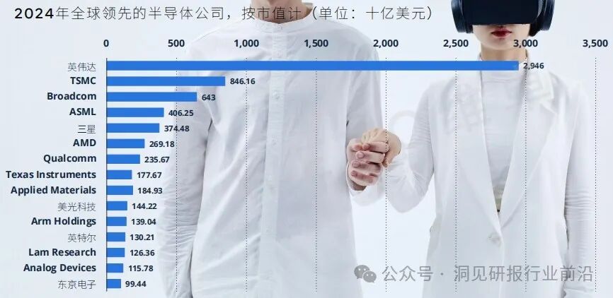 截至2024年6月5日,英伟达以2.95万亿美元的市值位居半导体公司榜首,其次是台积电、博通和阿斯麦等公司。