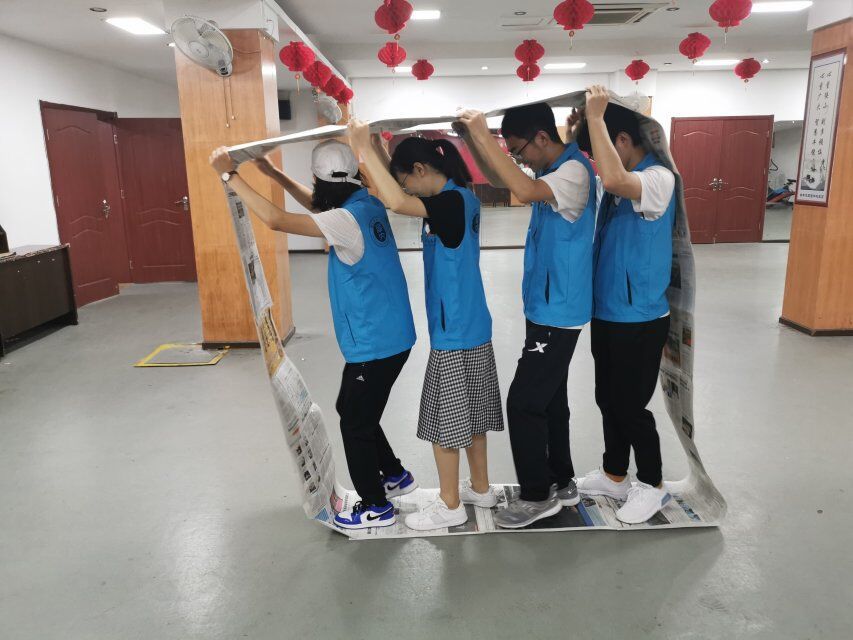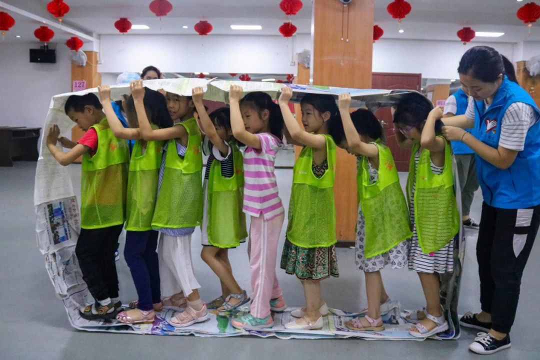 孩子们一起走在“风火轮”里,队员们在他们身后牵着报纸。学生们能够放心的走,因为队员们一直在他们身后。