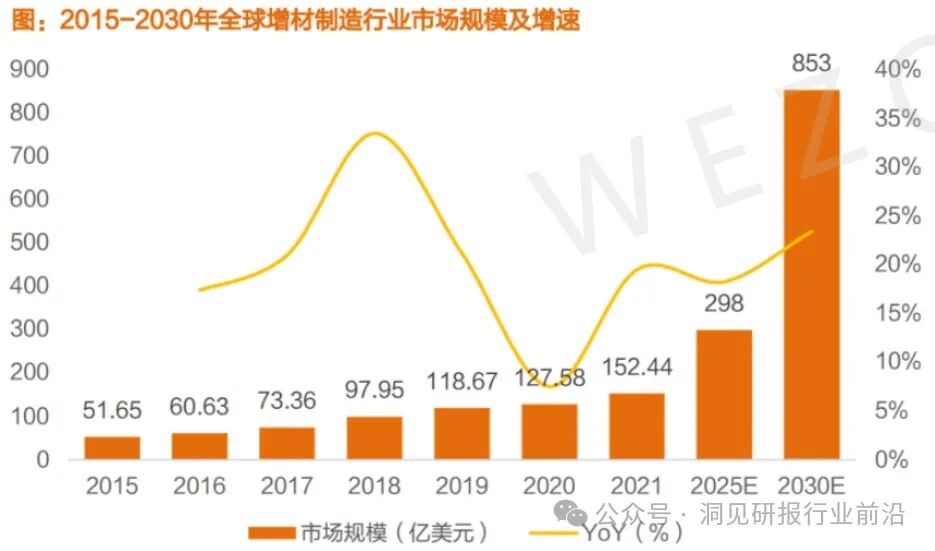 2025年全球增材制造收入规模将达到298亿美元,2021-2025年CAGR为18.24%;2030年增材制造收入规模将达到853亿美元,2025-2030年CAGR为23.41%。