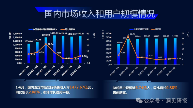 《2024年1—6月中国游戏产业报告》显示,今年1-6月,国内游戏市场实际销售收入1472.67亿元,同比增长2.08%,增长趋势较为平稳。游戏用户规模6.74亿,同比增长0.88%,再创新高。