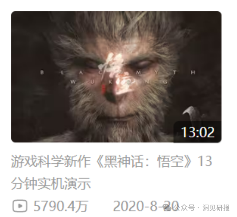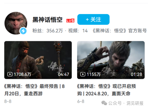 这是一款由中国游戏开发商游戏科学(Game Science Studio)研究开发的动作角色扮演游戏,此前在研发阶段就备受关注。早在2020年8月,游戏开发商在B站发布的一则13分钟实机演示视频爆火,截至目前播放量已突破5700万。2024年8月8日发布的一则发售预告片,播放量也超过1700万。游戏正式上线前,《黑神话》官方账号在B站就已拥有350多万粉丝。
