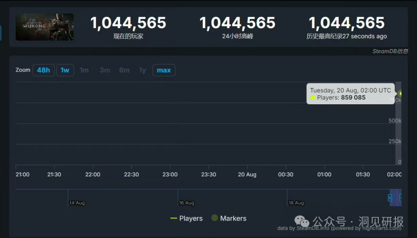 8月20日,《黑神话:悟空》在全球上线。正式发售仅1小时,便登上Steam最热玩游戏榜首,玩家人数超100万。SteamDB数据显示,上线当日,《黑神话:悟空》同时在线玩家数最高达220万(2,223,179),创下历史次高。