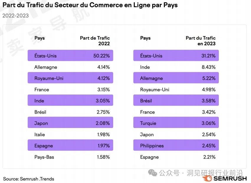 在2022年至2023年间,美国市场的电商流量份额同比下降了19%,印度市场的电商流量2023年增长了8.43%,并跻身全球电商流量第二大国家,德国退居第三。