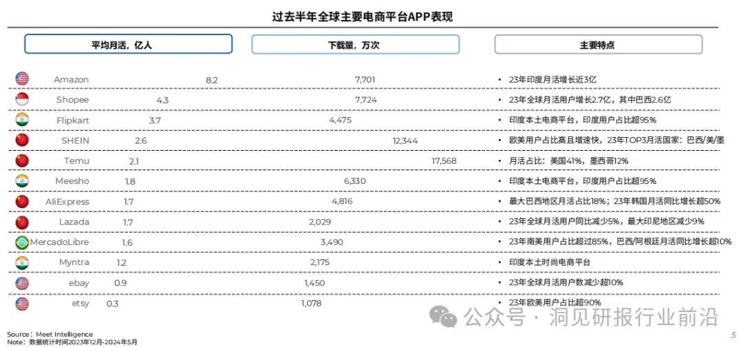 全球主流电商平台APP表现——Amazon月活全球第一,但Temu、SHEIN下载量抢眼。