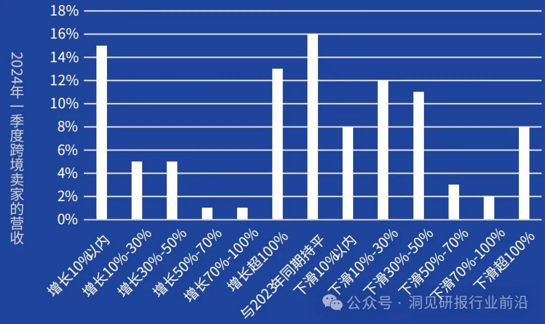 相比2023年同期,跨境电商卖家在2024年一季度的营收方面有所改善。四成卖家表示营收相比上一年同期增长,44%卖家表示营收同比下滑。