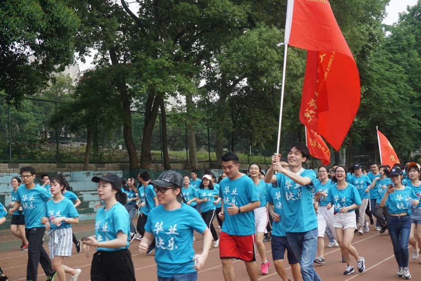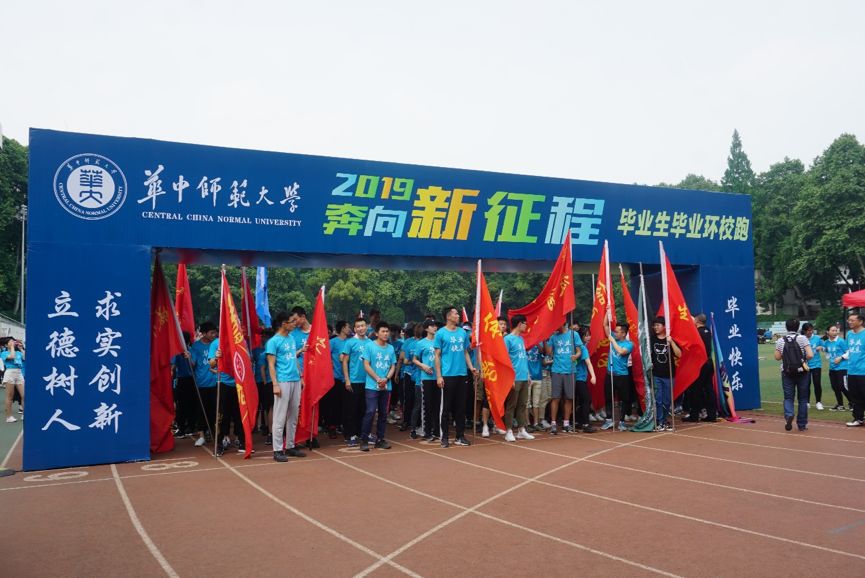 下午两点半,华中师范大学2019届毕业生毕业季主题活动启动仪式正式开始。我校党委副书记覃红致辞,殷切寄语毕业生珍惜时光、有效利用学校宝贵学习资源,引导大家树立远大理想,努力成为中国特色社会主义事业的合格建设者和可靠接班人。开跑前,体育学院教师范晓红带领大家做热身运动。随着一声发令枪响,2019“奔向新征程”师生环校跑开始。师生们从佑铭体育场出发,途径电影场、音乐学院、七号楼、博雅广场、化学楼、桂中路,最后从桂香园、西区篮球场、游泳池跑回佑铭体育场。跑完全程后,毕业生们在终点处领取纪念证书,合影留念。