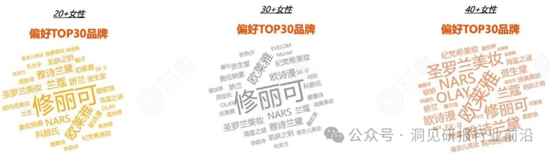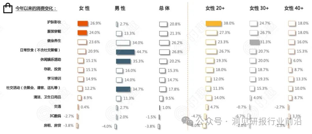女性在护肤彩妆、服装穿戴、健身养生悦已性消费上在今年消费复苏以来投入更多,其中20+女性在护肤彩妆上更舍得投入,30+女性更注重健身养生。