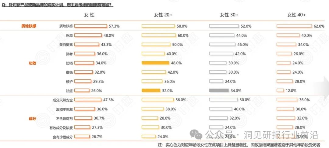 肤感是构成女性购买护肤品的重要决定因素;在功效上,除了基础保湿功能外,美白、抗老成为购买的区别需求;成分的天然性、安全性、温和性和不含防腐剂成为重要需求。
