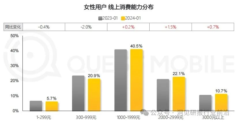 女性消费力逐年提升,2,000元以上高消费能力增长显著。