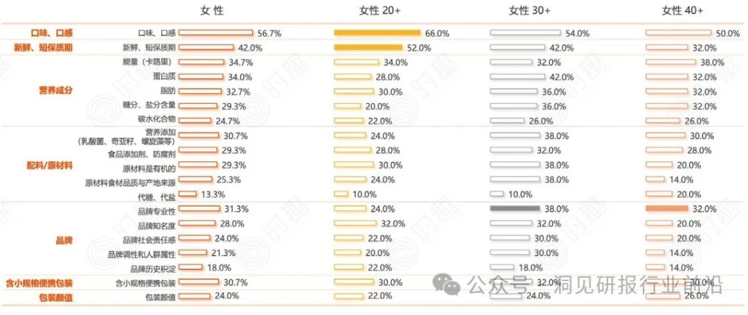 大部分女性消费者购买零食首先看重口味口感,其次在意产品新鲜度。尤其爱美且关注健康的女性会在意控制热量和脂肪摄入的同时,更希望零食是有营养的、高蛋白以及有额外营养添加。