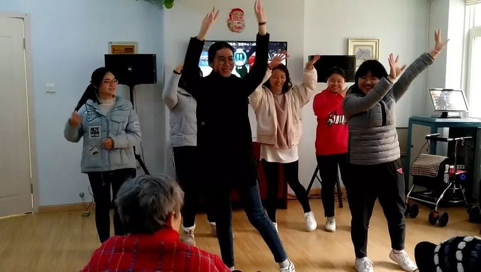 到达养护中心后,在负责人李俊豪的安排下,志愿者们来到活动室,与各位老人一同载歌载舞,欢度妇女节。
