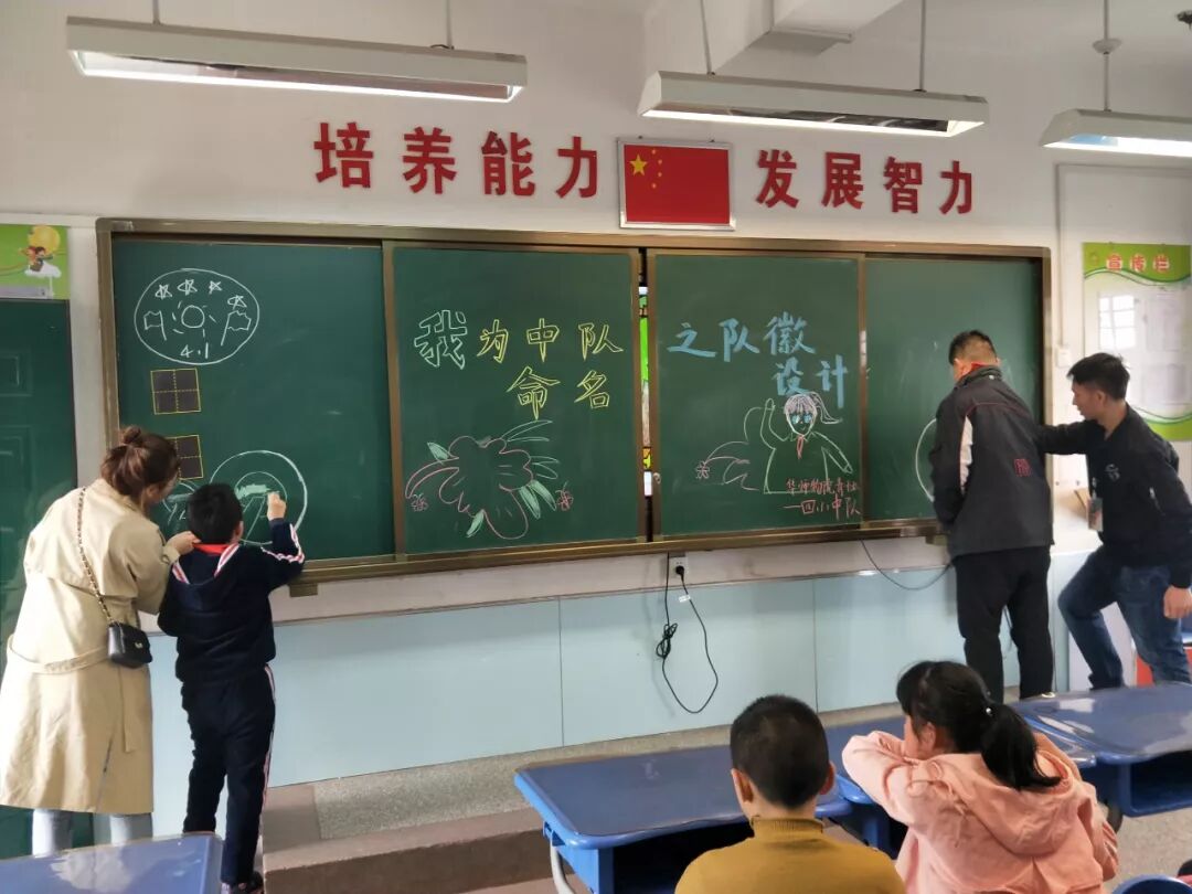 谭炜俊给同学们看完所有的队徽后,从中挑出几个简单的队徽说明了队徽的组成元素,讲解这些队徽的设计意义。他随后让同学们想一想如何为自己的班级设计队徽,并请同学们上黑板尝试设计队徽。同学们积极参与,现场气氛十分活跃。