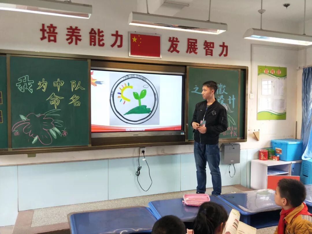 班会临近结束,经过同学们投票,四年级一班的中队队徽确定为一棵茁壮成长的小树,树上还有即将成熟的果子,这代表即将长大的同学们。班会结束,临走之前,同学们纷纷来和志愿者们道别。为了让同学们拥有一个干净整洁的学习环境,志愿者们把教室打扫干净才一同离开。