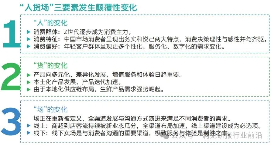 零售3.0时代已经到来,“人-货-场”三大要素已发生颠覆性的转变。近年来,中国零售市场涌现出许多耳熟能详的关键词,如KOL、碎片化、虚拟化、体验式、全渠道、即时消费等。