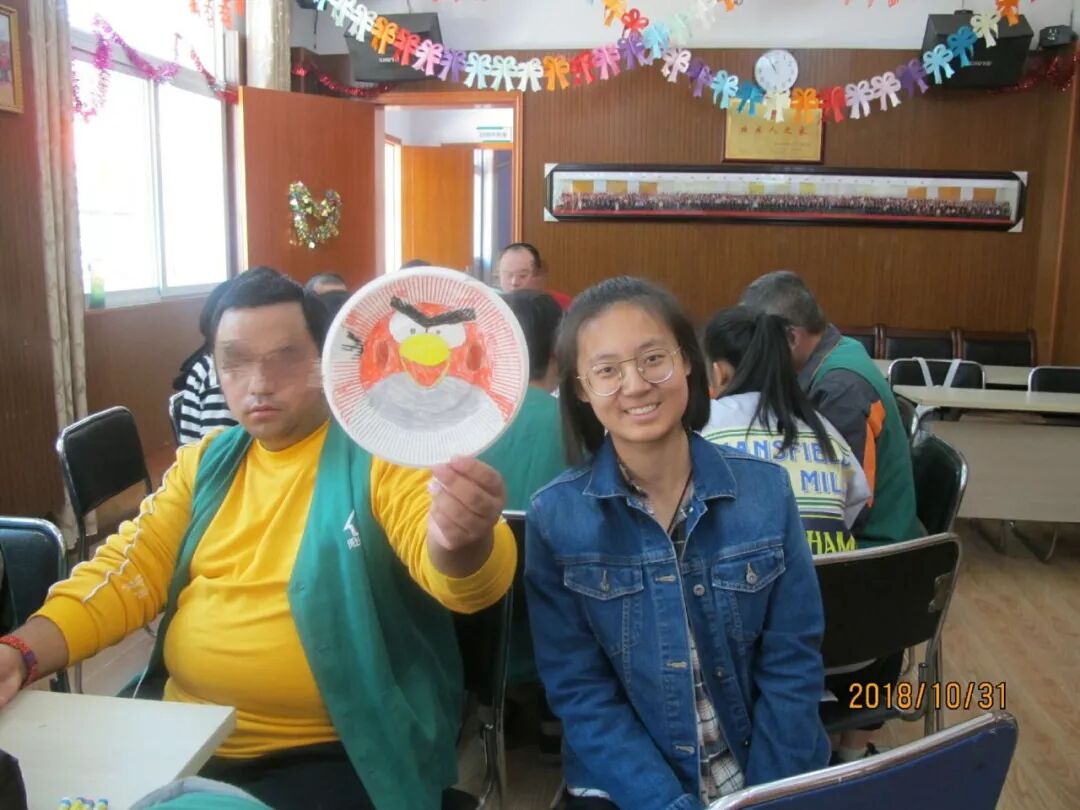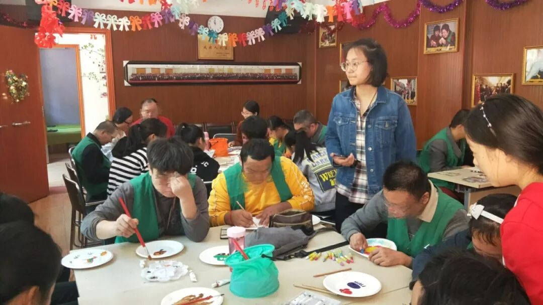 本次活动的志愿者先给自己起了便于服务对象记住的小名,并亲切地向大家做了自我介绍。在短暂的相互了解后,志愿者们与服务对象间的关系亲近了许多,活动氛围轻松融洽。随后志愿者们引导服务对象分享自己的理想,让服务对象根据自身的想象力和个性,在纸盘上完成绘画。志愿者们静静地在旁边观察,在必要的时候给予帮助,协助他们完成创作。