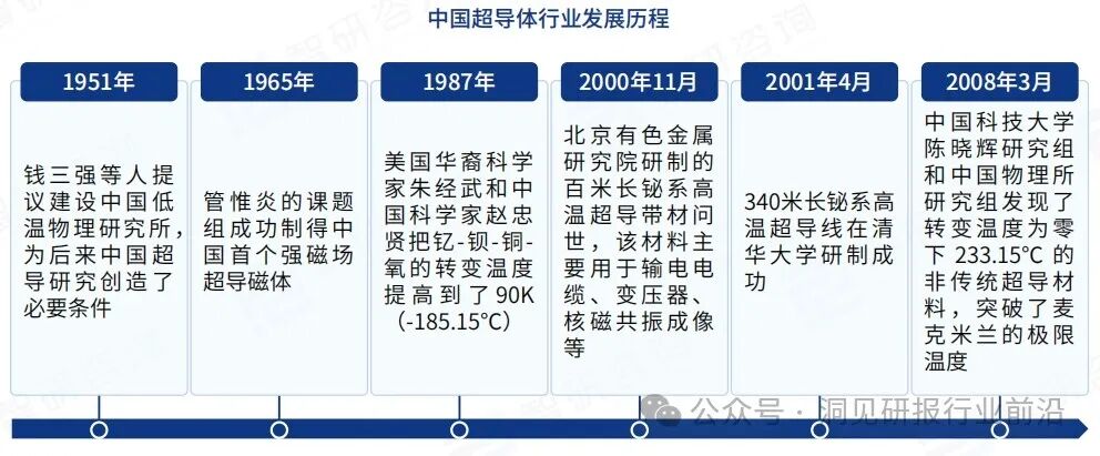 超导材料的探索主要经历了几个阶段:1911~1986年,是低温超导材料发展阶段,中国科学家研制出中国首个强磁场超导磁体,中国超导领域发展初县规模。在1987年到1999年期间,中国科学家发现了打破液氮77K温度限制的高温超导体材料,中国超导体行业取得突破性进展。2000年至今,中国跻身少数掌握超导线材产业化的国家行列,并持续对“室温超导”的进行深挖探索不断突破温度极限。