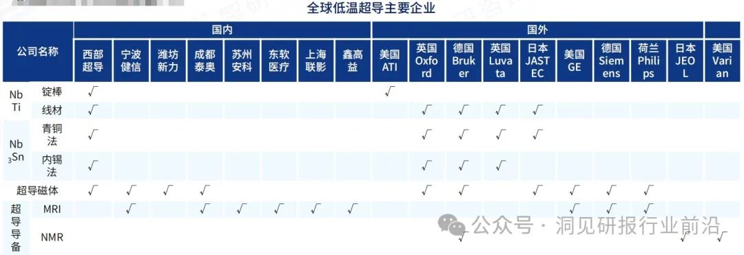 低温超导产业链相关的行业包括超导锭棒、超导线材、超导磁体和超导设备。低温超导线材的制备过程复杂、制备周期长、工序和质控点多,全套技术形成难度大。从全球来看,国外公司或专注某一领域,或横跨多个领域,但在低温超导领域几乎无技术积累。而西部超导是目前国内唯一低温超导线材商业化生产的企业,也是目前全球唯一的铌钛锭棒、超导线材、超导磁体的全流程生产企业。