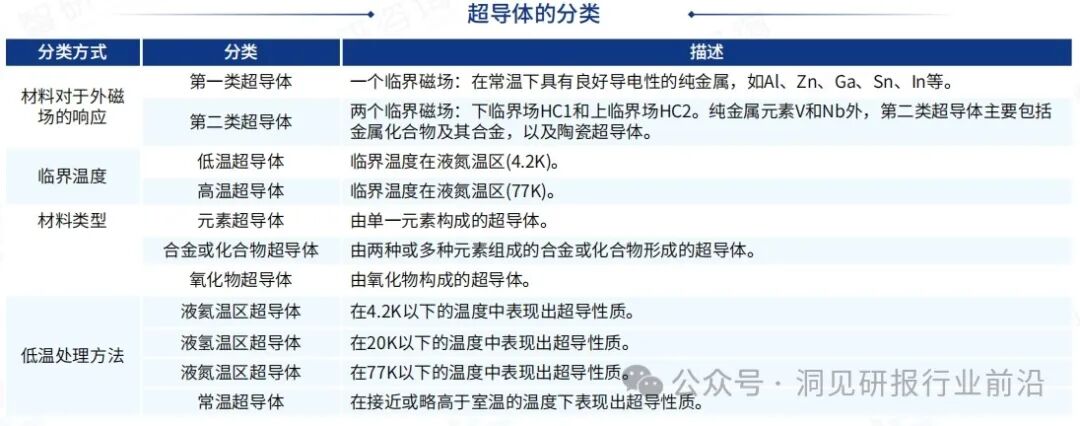 超导体,又被称为超导材料,是一种新型材料。超导全称超导电性,指当温度降低到某一临界温度(一般为较低温度)时,电阻突然消失,电流可以无阻流动的现象,具备这种特性的材料即为超导体。超导体分类方式较多,可以根据材料对于外磁场的响应、临界温度、材料类型、低温处理方法进行分类。