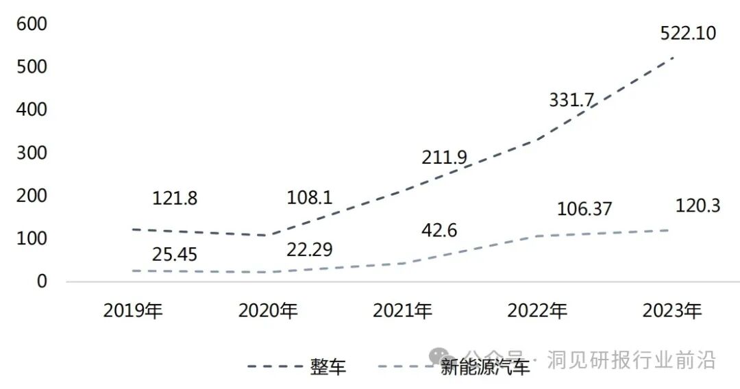 2023年,我国汽车出口量达到522.1万辆,同比增长57.4%,其中新能源汽车出口量达到120.3万辆,与汽车总出口增长趋势较为一致。