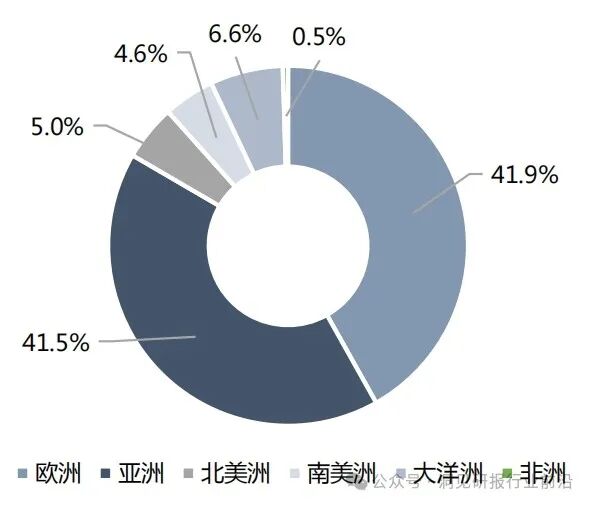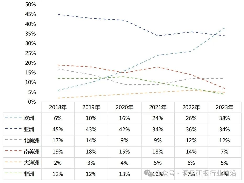 分区域来看,近五年我国汽车出口增加主要得益于欧洲和亚洲市场的贡献。我国对欧洲地区的汽车出口量从2018年的6%飙升至2023年的38%。目前,俄罗斯、比利时、英国为我国出口欧洲地区的主力军,受地缘政治影响,欧美日韩品牌退出俄罗斯市场,中国品牌强势补入。