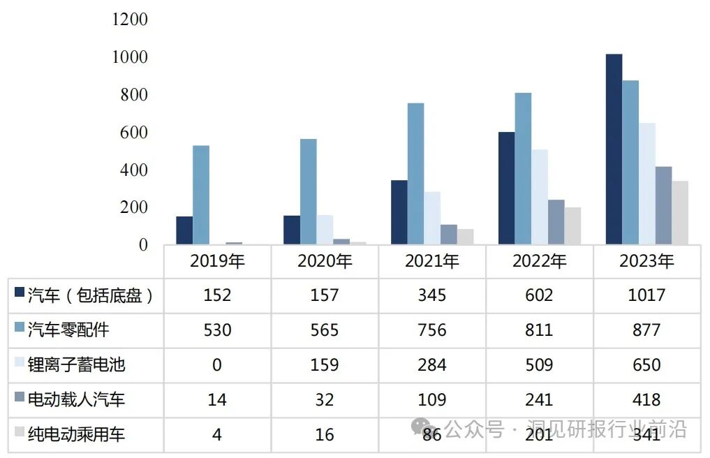 锂离子电池从2019年的零出口逐步增长至2023年的650亿美元出口额;电动载人汽车以及纯电动乘用车也分别达到了418亿美元和341亿美元的高出口额。