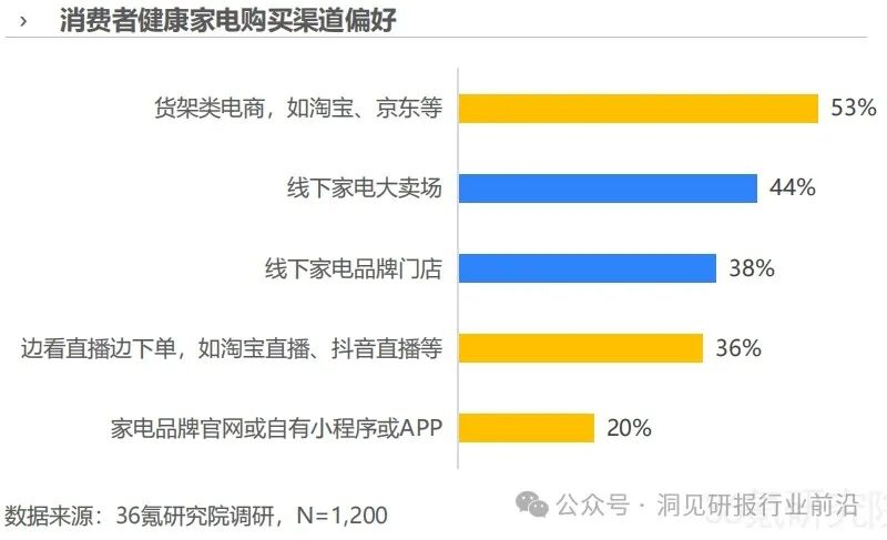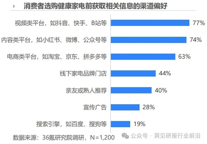 对于健康家电兴趣人群而言,视频类、内容类和电商类平台是其选购健康家电前获取相关信息的主要渠道,占比分别为77%,74%和63%。从购买渠道来看,多元化特征明显,线上与线下并存,其中货架类电商获得更多消费者青睐(53%)。