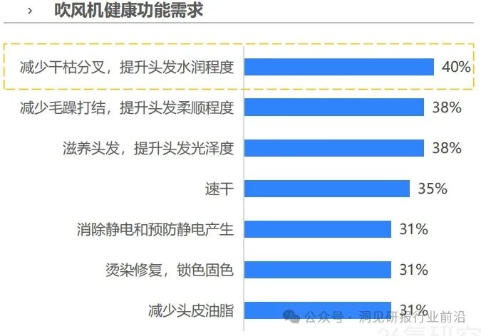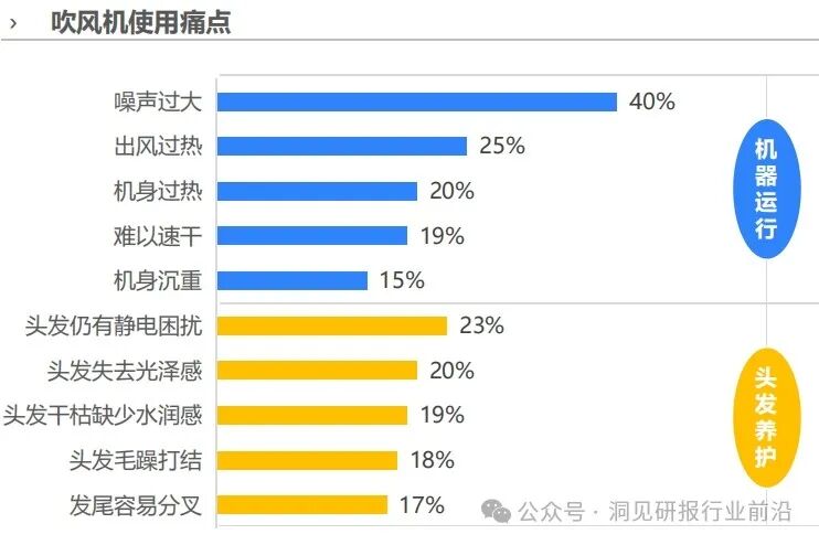 个人护理典型产品——吹风机的使用痛点聚焦在机器运行和头发养护两方面。噪声困扰、出风过热、机身过热是机器运行期间容易出现的问题,而静电困扰、头发缺少光泽感和水润感则是消费者认为当前吹风机产品相对缺失的健康功能。具体来看,40%用户期待家电科技能够帮助缓解吹风机使用后易产生的干枯缺水问题,从而提升秀发水润程度。