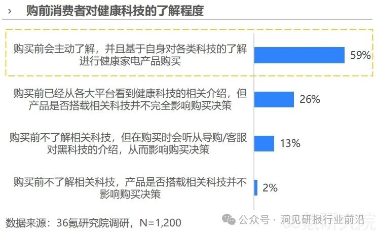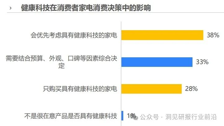 健康科技自然也成为消费者家电购买决策的影响因素之一:38%受访者表示优先购买搭载健康科技的家电,另有28%用户更是只购买具有科技属性的健康家电。进行家电购买决策前,59%消费者会主动了解健康科技相关知识,13%用户表示尽管对健康科技不了解,但购买时会通过导购或客服的介绍获取相关信息,进而影响购买行为。