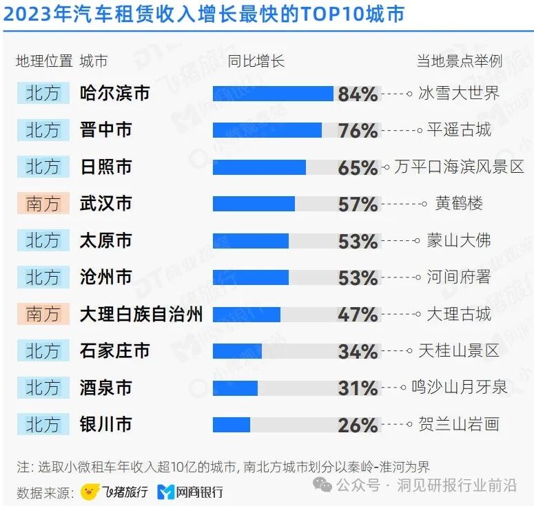 汽车租赁收入增长最快的TOP10城市中,8成是北方城市,其中哈尔滨同比增长84%,领先全国。