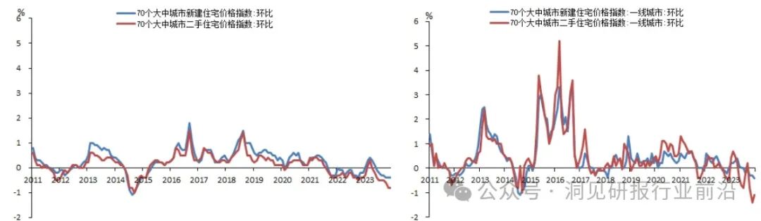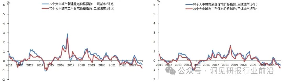 2023年,70个大中城市的新建商品住宅销售价格同比下降0.89%,同比降幅较2022年收窄1.4个百分点;二手商品住宅销售价格则下降了4.07%,同比降幅较 2022年扩大0.31个百分点,下跌幅度较大。
