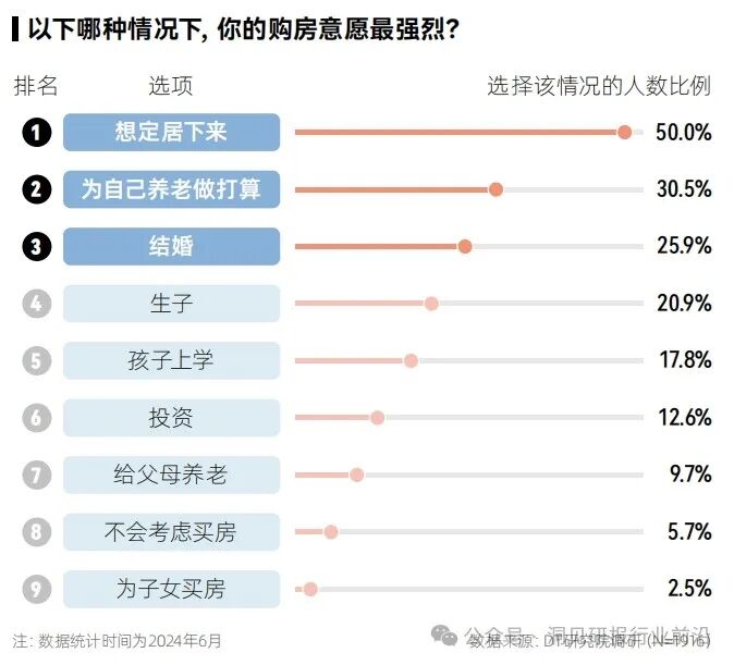 男女购房动机存在差异,女性购房意愿最强烈的三大场景分别是定居、养老、生子,而男性购房意愿最强烈的三大场景分别是定居、结婚、生子。