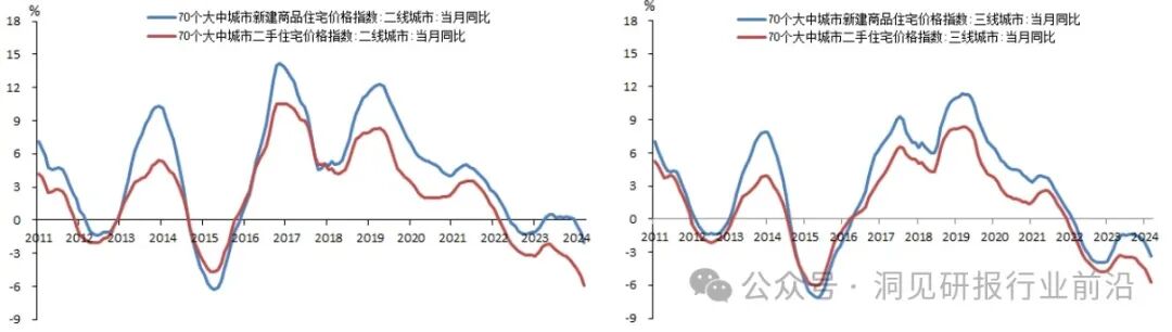 2024年第一季度,70个大中城市的新建商品住宅销售价格同比下降 2.65%,同比降幅较2023 年末扩大了1.77个百分点;二手住宅销售价格则同比下降5.90%,下跌幅度较大,且同比降幅较2023年末扩大了1.83个百分点。