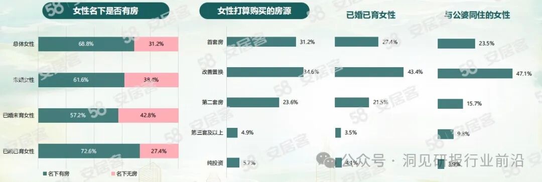 在近年内有购房需求的女性中,有31.2%的女性打算购房首套房,34.6%的女性希望卖掉目前的房源改善置换一套,已婚女性、与公婆同住女性换房愿望更加强烈。