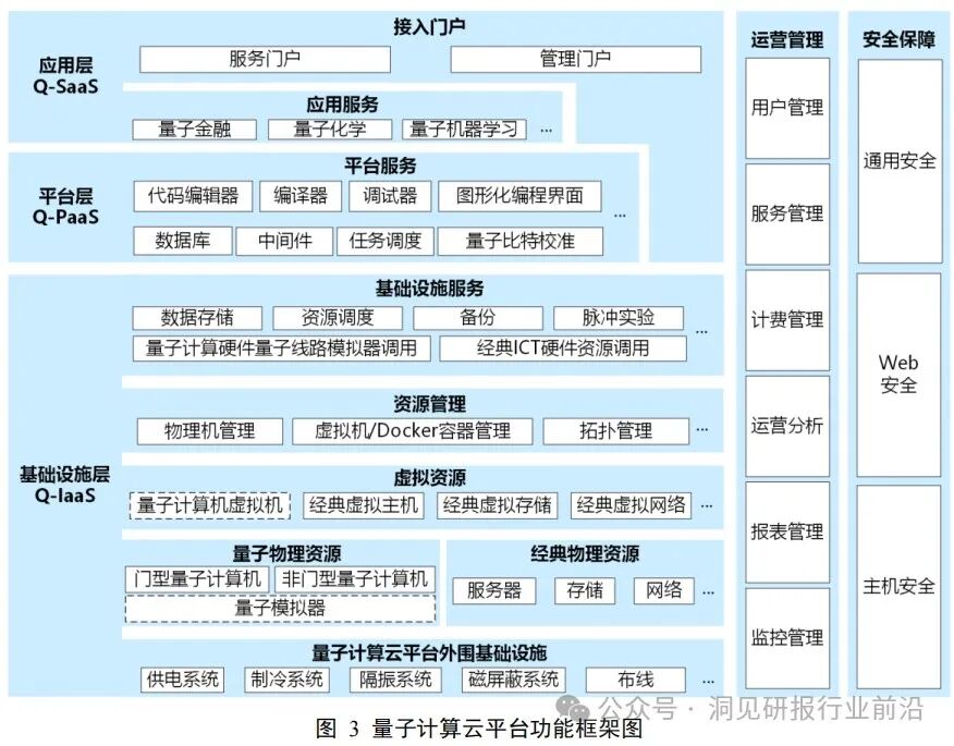 量子计算云平台的功能架构如图所示。主要由接入门户、应用服务、平台服务、基础设施服务、资源管理、虚拟资源、物理资源、外围基础设施、运营管理、安全保障等功能模块组成。
